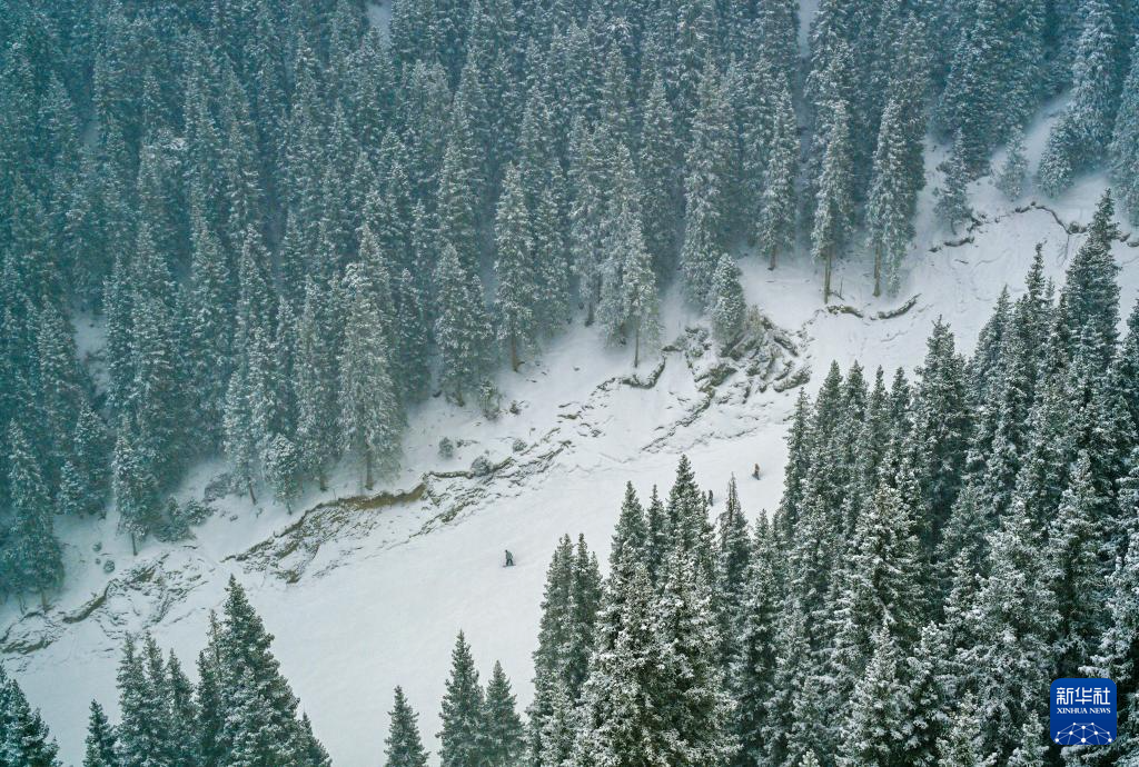 这是世界野雪巡回赛2024-2025雪季中国新疆禾木站工作人员在禾木吉克普林国际滑雪度假区踏勘比赛场地(2024年12月4日摄,无人机照片)。
