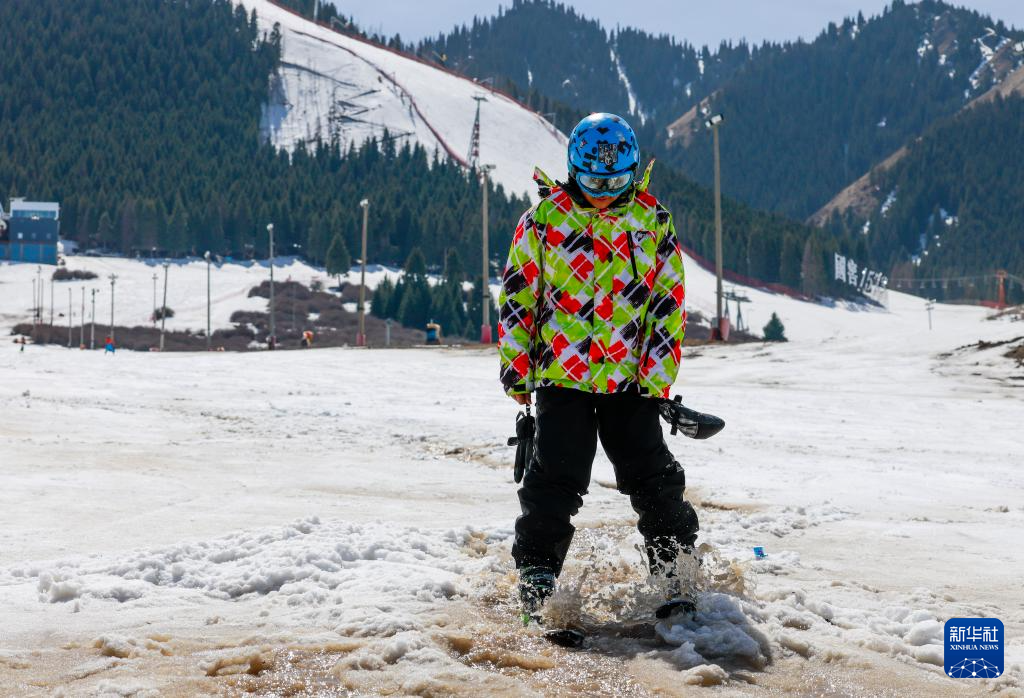 这是一名雪友在新疆丝绸之路山地度假区滑雪,部分区域的积雪已经融化(2025年4月5日摄)。