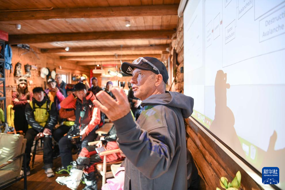 这是一名来自新西兰的滑雪专家在新疆阿勒泰禾木吉克普林国际滑雪度假区向中外雪友讲授滑雪知识(2024年12月3日摄)。