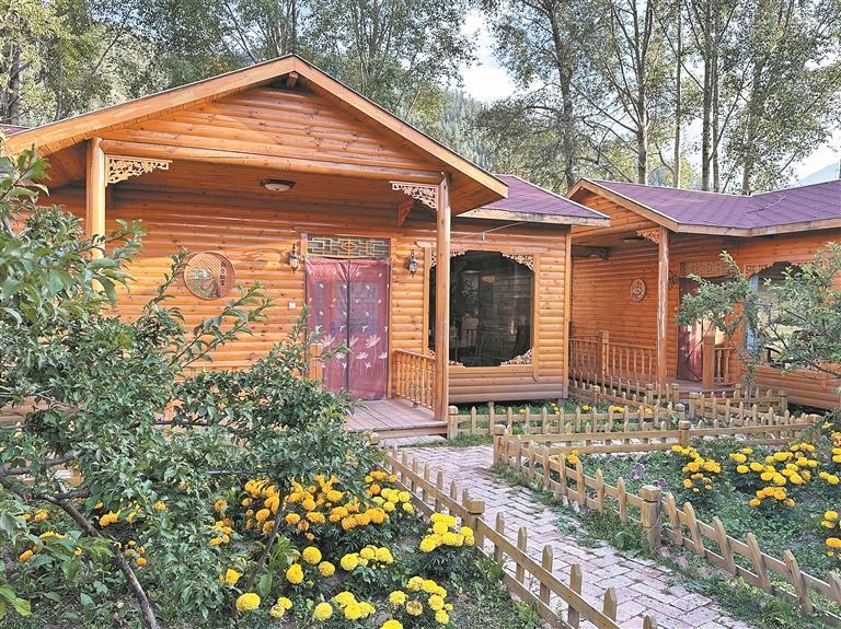 环视一周,几座木质小屋映入眼帘,原木色外观透着古香古色的韵味;屋前精心布置的花园里,鹅黄、橘红、烟紫的花儿开得灿烂,绿叶繁茂的树木点缀其间,满是生机;一条砖石铺就的小径延伸向小屋门廊,周围树木葱郁,整体环境清幽雅致。