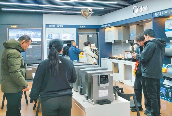 1月4日,在西安市苏宁易购金花路店,以旧换新咨询台前围满了顾客。工作人员正忙着帮顾客测算旧家电折价和新家电补贴。
