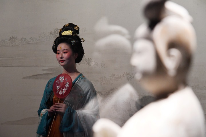身着复原唐装的演员在西安博物院为游客呈现唐朝生活风貌。新华社记者李一博摄