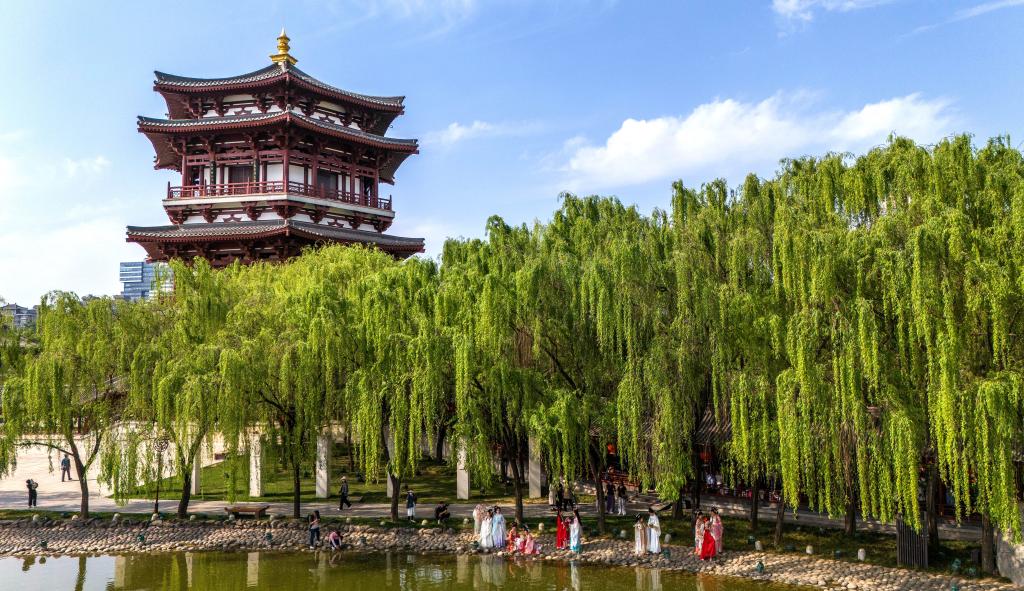 “一日看尽长安花”,大明宫遗址的夯土台基上,高铁掠过时卷起的风,吹散了某个春夜长安城枝头的繁花。被雨水浸润过的“天街”,如今蒸腾着肉夹馍的香气,车水马龙、热闹繁华。曲江千顷,诗赋的墨迹在游船桨声中重新晕开,与岸边咖啡馆拉花上的云纹连成一片。