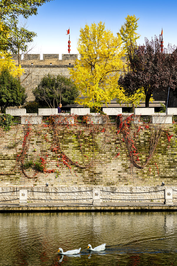 环城公园内,晨练的市民互相打着招呼,不远处,14.6公里的护城河宛如流动的玉带环绕着城墙,一只白鹭在岸边优雅踱步梳理着羽毛,几只野鸭钻出水面,激起层层涟漪,为冬日增添了几分灵动与活力。