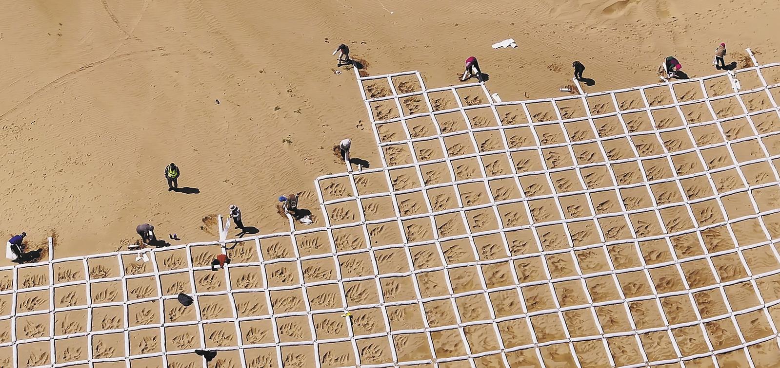 格尔木市位于柴达木盆地沙漠中南部,属于极干旱地区。当地在昆仑山北麓那棱格勒河以西的主要沙源区“因害设防”开展工程治沙。格尔木市林业和草原局“三北”专班负责人张磊介绍,格尔木“三北”工程六期实施以来,有十几家央企、省属国有企业、私企进场,利用技术、资金、管理优势开展大面积工程固沙。