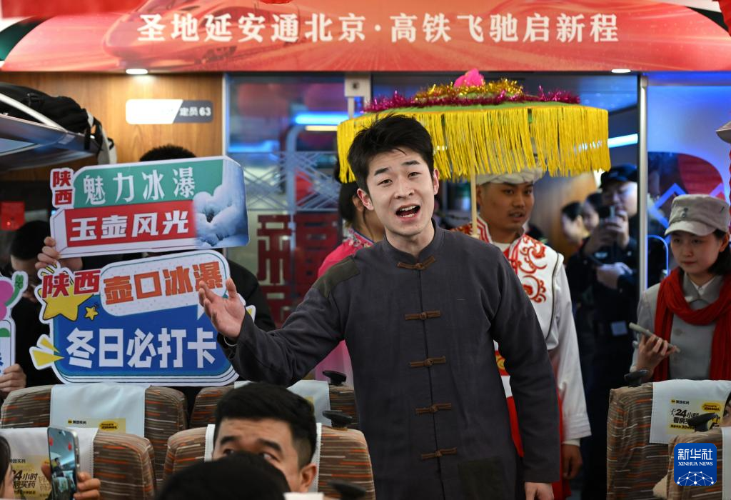 1月26日,演员在延安开往北京的G359次列车上为旅客演唱陕北民歌。