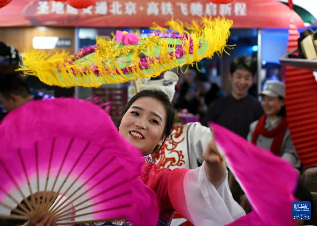 1月26日,演员在延安开往北京的G359次列车上为旅客表演陕北秧歌。
