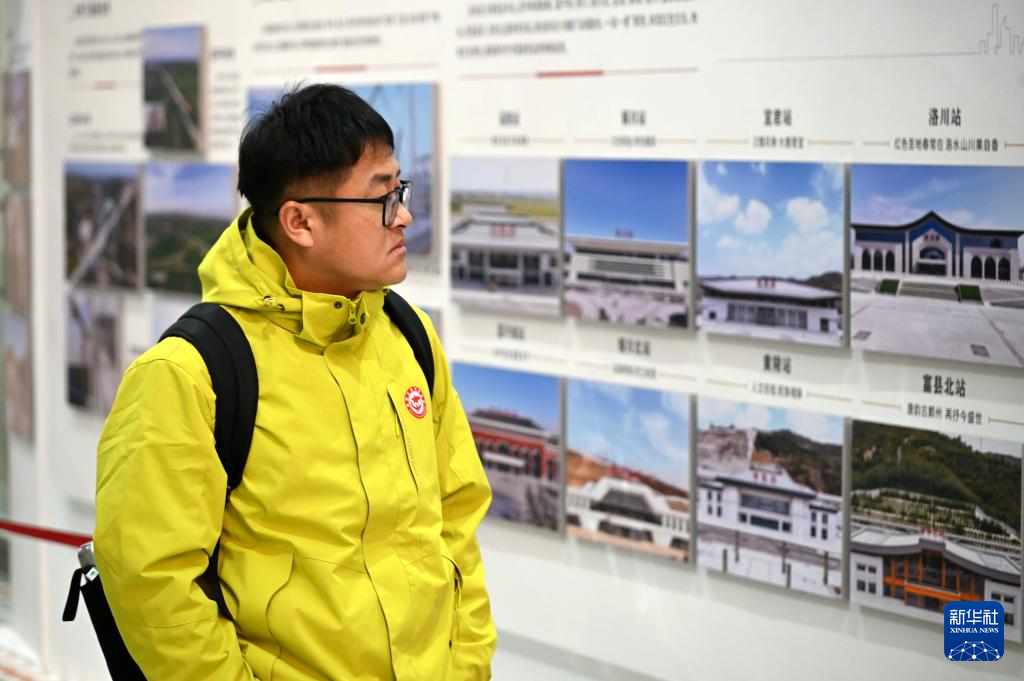1月26日,乘坐延安开往北京G359次列车的旅客在延安站候车大厅内观看西延高铁建设图片展。