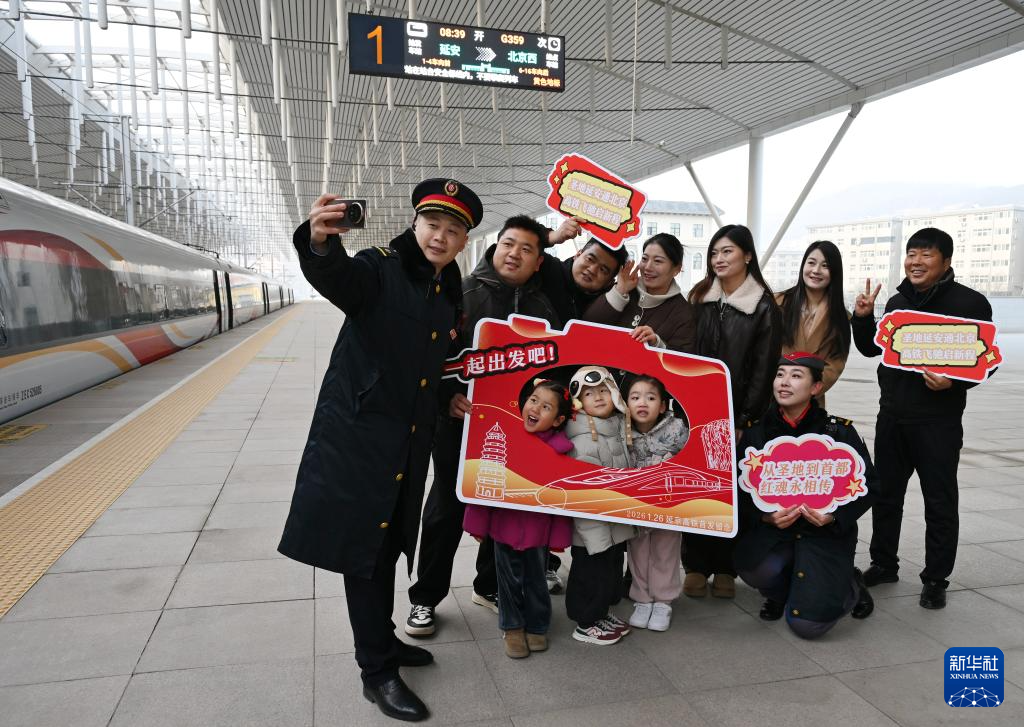 1月26日,铁路工作人员和乘坐G359次列车的乘客在延安站站台合影留念。
