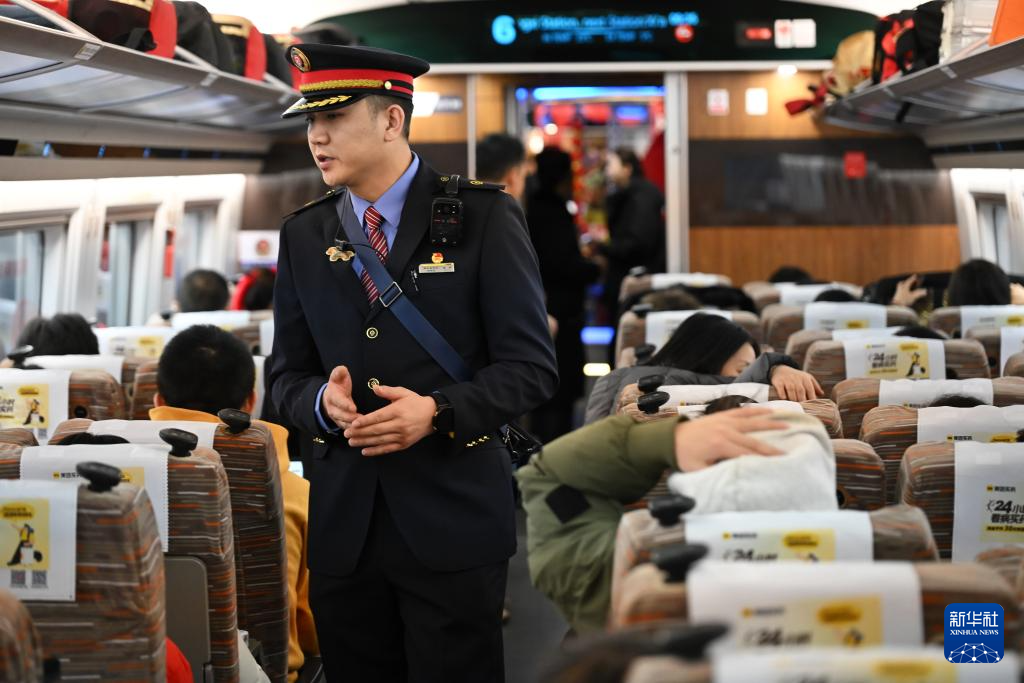 1月26日,列车员在延安开往北京的G359次列车上提醒旅客到站信息。