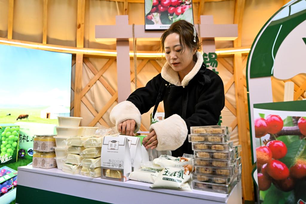 2月1日,在锡林郭勒那达慕风情园内,工作人员正在摆放奶食品。新华社记者李志鹏摄